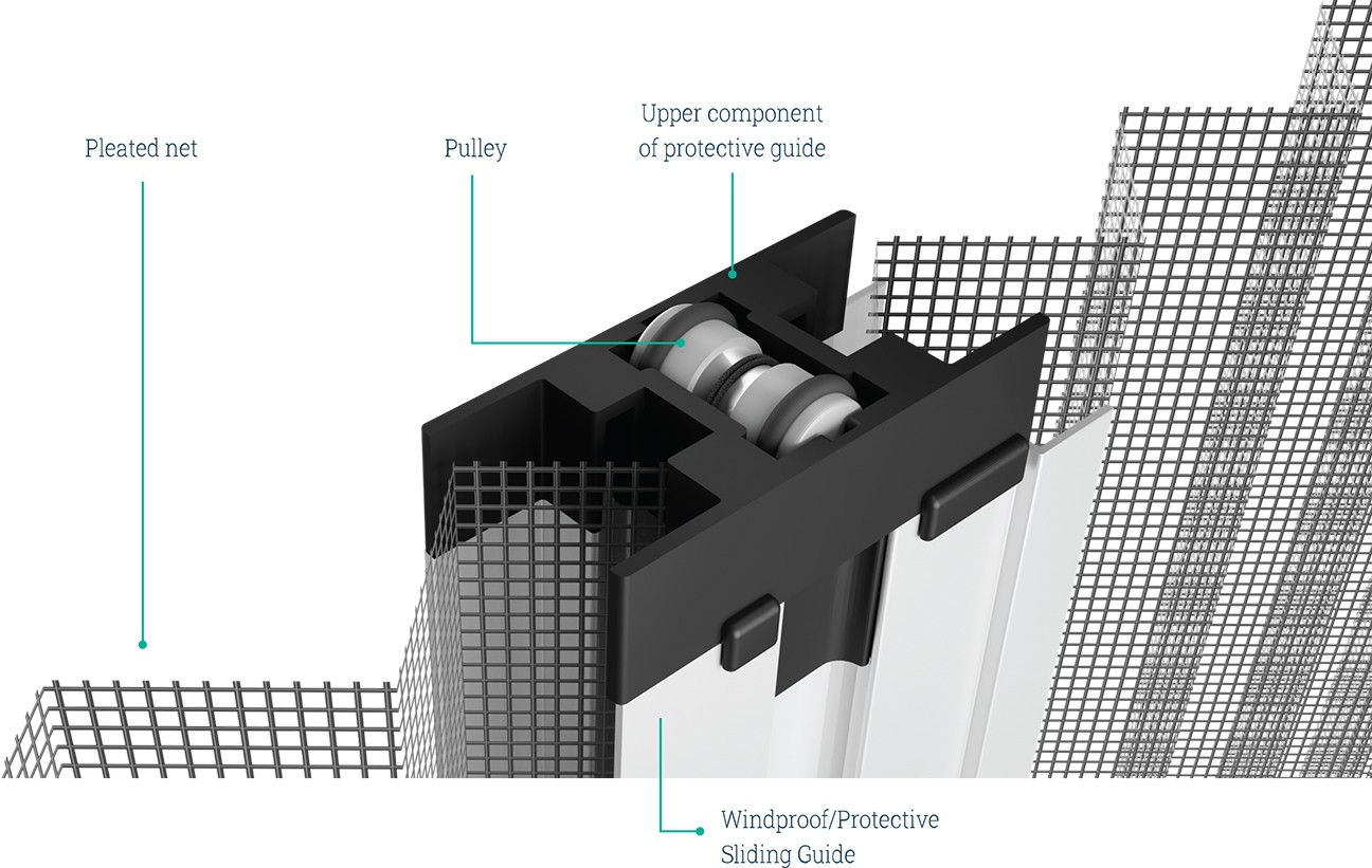 Le guide de coulissement de protection contre le vent protège la toile plissée de la moustiquaire Royal contre le vent, pour des largeurs supérieures à 1,40 m et inférieures à 5 m.